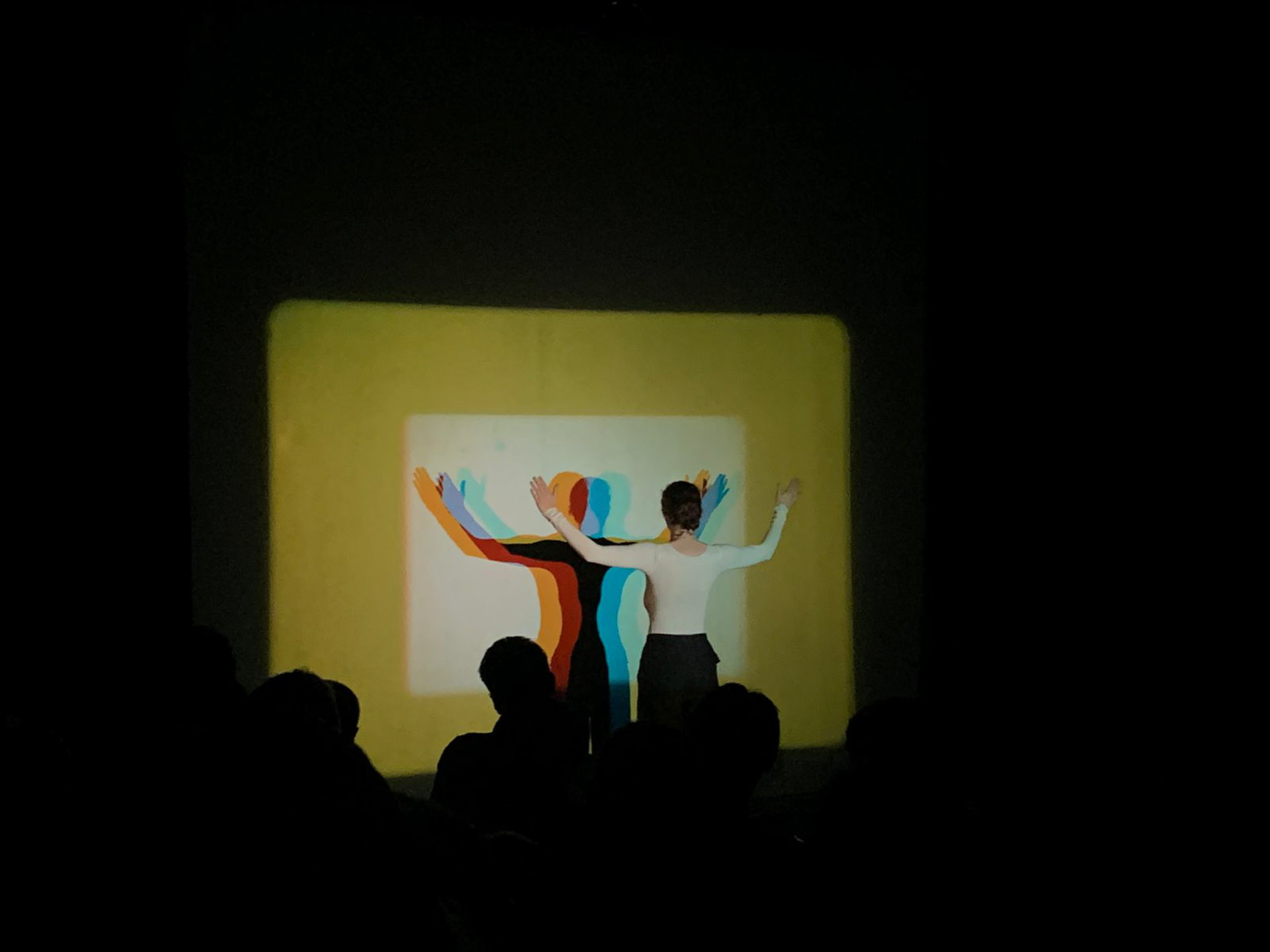 It is in this backdrop that Le Grice conceptualised and realised Horror Film 1. First staged in 1971, this film-performance used color film-loops running through three projectors, the one casting the central image using a zoom lens with an accompanying single-channel tape sound of breathing, as the body of the performer – historically Le Grice himself, nude or shirtless – moves in a straight line with arms outstretched, from the destination of the light to its source, the screen to the projectors, casting increasingly complex colored shadows by intercepting the projector beams directed at the white surface. In referring to horror in the title of the film, Le Grice retrieves what for many like Jacques Tourneur, is the genre’s cardinal feature, the shadows. At Cavia, Horror Film 1 was performed by Betija Zvejniece, who had earlier done so at the European Media Arts Festival (EMAF) in Osnabrück, 2025. This re-enactment or repetition, inherently incomplete, opens up several questions on subjects of originality, archiving, interpretation, and adaptation. Performance Arts by nature rely on the uniqueness of each performance – repetition with variation is one way of putting it – untethered from any notion of rigid originality as in painting. Venues, audiences, and physical bodies of performers are expected to change, resize, or age, but such adaptability is less negotiable when it comes to the artist-performer. Whether substituting the artist as performer in such a case de-authors the performance is one question, yet another, as far as analogue expanded cinema is concerned, is if in doing so, we enter the realm of archiving? If restaging has an archival claim in the absence of the artist, it is distinct from documentation via photographs, videos, and instructional notes. It remains invested in the experiential, which is a critical part of the original work, something that is not accounted for in conventional archiving strategies. Alternatively, it is equally logical to consider restaging as an adaptation or an interpretation, as with musical performances of older compositions. The impact of the body of the artist and its relationship to novelty of the performance hinges on several factors, for example if the body is the medium of the work as in feminist performances, or if it channels more neutral perceptual concerns as in the case of Le Grice (granted that such distinctions are not always straightforward). In the performance of Horror Film 1, the gender switch, between Le Grice originally, and in this case, Zvejniece, inadvertently brings up the question of conventional gender roles in the horror film genre, of active males and passive females, and possible subversion of such stereotypes.