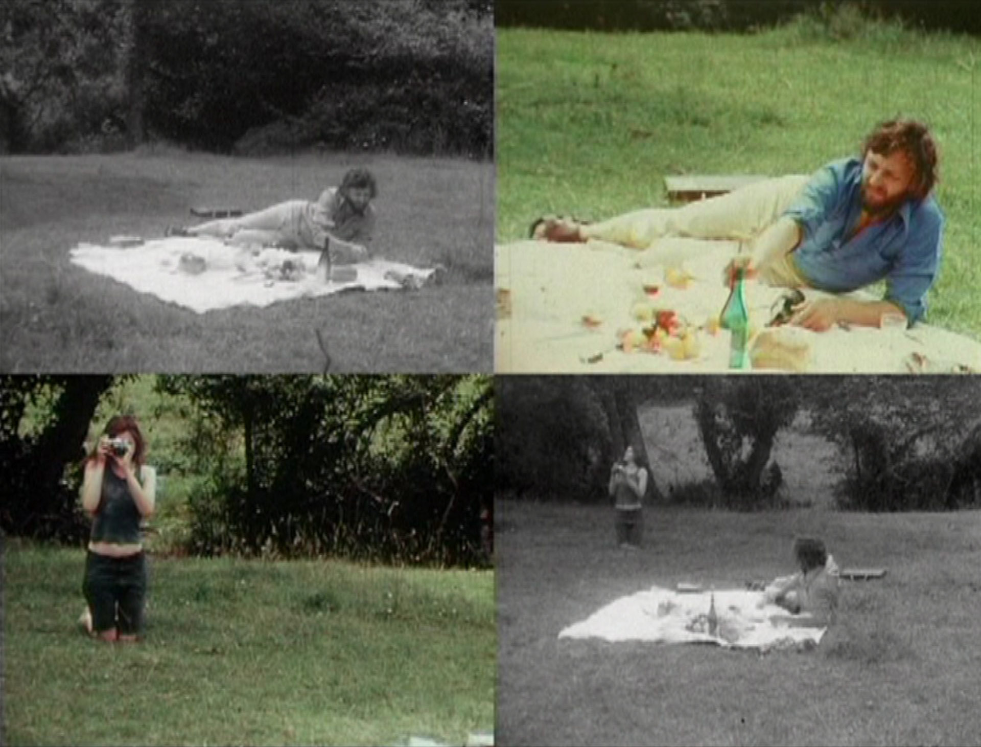 Take away that “unresolved” body from the room and re-staging suddenly has to tackle less pressing questions about the integrity of the cinematic work, which is the case with the other multi-projector film of the night, the hour-long After Manet. In it, the intermittently synchronized 4 projectors cast a 2×2 grid on the screen that combines into an overall 4:3 configuration. Like Horror Film 1 that solicits Da Vinci’s The Vitruvian Man, here again Le Grice, who came to filmmaking from painting, draws upon a motif from art history, one that was popularised by the French painters in the 18th century – the Garden Party – explicitly referring to two portrayals, one an early precursor of the genre by Giorgione (Le Concert champêtre, 1509), and the other, a late variant by Manet (Le Déjeuner sur l’herbe, 1862). For the film, Le Grice and three of his compatriots from the Filmaktion group – Annabel Nicholson, William Raban, and Gill Eatherley – individually took charge of one camera each. The different quartets – the filmmakers, the cameras, the screens, the film stocks (Black and White and Color film in both positive and negative) and the four projectors – together depict a spatially fractured scene of a picnic, with the four filmmakers switching their positions between in front of and behind the cameras. The generated perspectives, either through variance in framing or through the positioning of the recording cameras, in combination with the discontinuous locationally-faithful soundtrack and the altering film stocks, offer an unusual representational model that continuously challenges the viewer to construct their own coherent description of the depicted scene. Le Grice here really stretches out the conventional projection situation, replacing montage, or possibly masking techniques, with a different simultaneity of images, allowing us to choose, if we intend to see a single screen divided into four parts or four screens adjoined together.