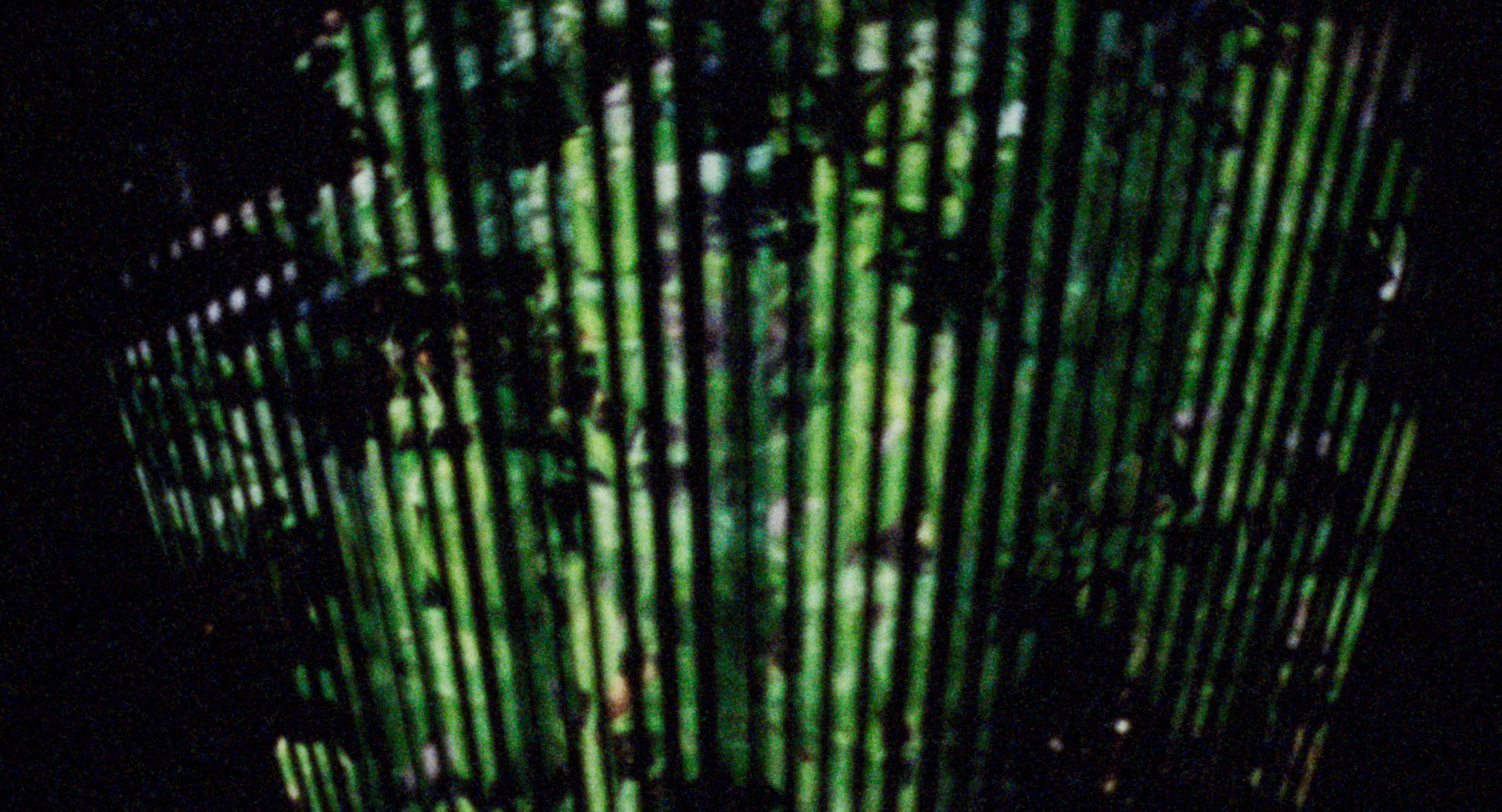 The second beat of the film continues this floating movement from distance to closeness. On the device, a projection of something leafy and green appears: a patch of pea plants. At first it presents the image in a wide view, and its mediated qualities are abundantly evident, with sound and image both clearly generated by virtue of the apparatus. The image becomes increasingly clear, its mediation less and less discernible, before it unexpectedly defies all perceptual limitations by seeming to penetrate impossibly far into the very molecules of its organic material. The image divides into bands of vivid color (fuchsia, gold, turquoise, red), depicting the breaking down of the visible material into its usually inaccessible abstract components. The projector’s sound continues to assert itself, highlighting the cinematic situation that makes this view possible. Finally, the incredible, imperceptible depth of the object is made legible at a molecular level. For the last moments, the filmmakers return outdoors and these abstract shots dissolve into a long view of the land around the greenhouses again, the brilliant star of the Earth’s sun shining beams of light over them and in every direction.